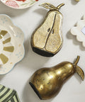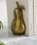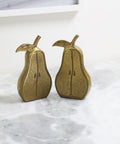 Meet the perfect pear(s)! The set of 2 cast aluminum Golden Pear Bookends are a charming accent for bookshelves & a great gift paired with a book or two. Featuring carved seeds on the flat cut sides & a dimensional stem & detailed leaves, these weighted decorative pieces add a bit of whimsy to home decor, whether used as functional bookends or as small fruit sculptures.