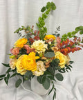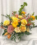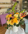 This arrangement features lush, gardenesque blooms in our signature design style. Presented in a timeless elegant tall white ceramic vase with the freshest seasonal flowers.